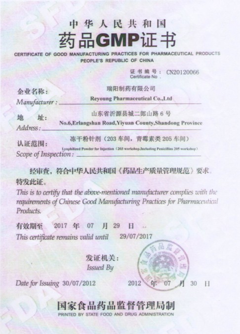 恭喜我公司合作的山东瑞阳制药厂荣获GMP证书!